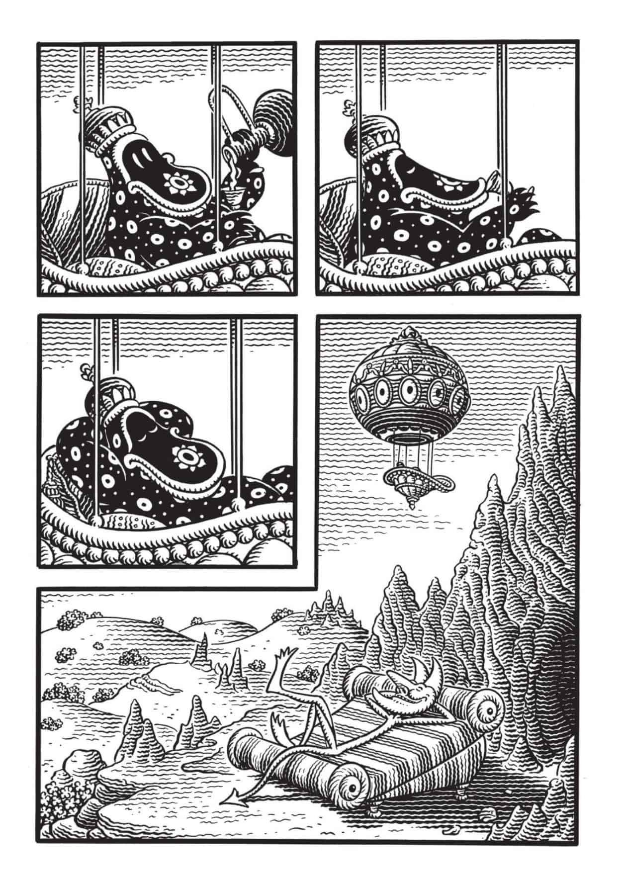 I found myself captivated by Woodring’s detailed linework, his monstrous inventions, and his uncanny ability to tell stories without relying on a single word. This is a 99 page graphic novel; an enormous amount of work went into it, and it’s a gorgeous piece of art first and foremost. I’m sure I fully understand this book, but I was happy to be able to appreciate it.